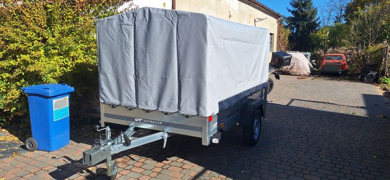 - Przyczepka samochodowa UNITRAILER Garden 265 Kipp o szerokości 150 cm w zestawie ze stelażem H-1100 oraz pokrowcem w kolorze szarym. Większe możliwości transportowe dla Ciebie lub Twojej firmy.